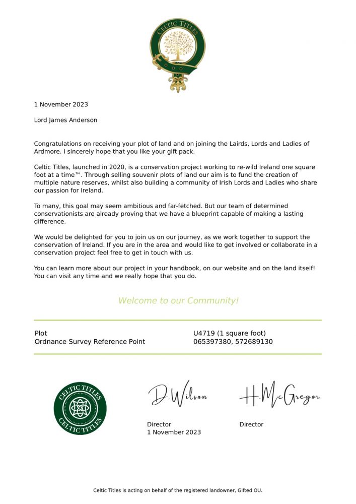 Титул Лорда или Леди и 1 квадратный фут земли в Шотландии (Kilnaish) (только цифровая *PDF версия)