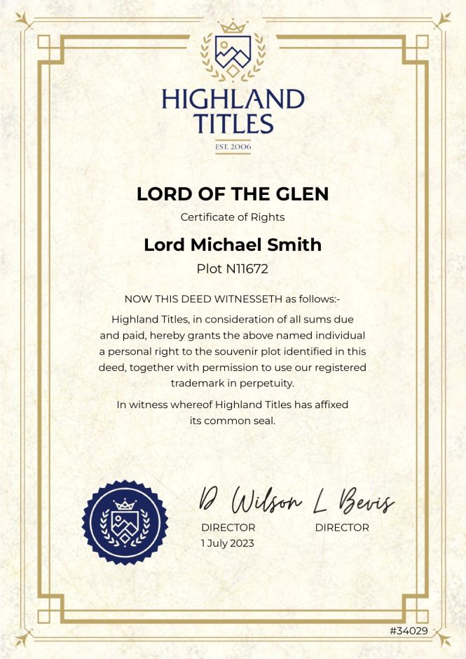 1 квадратный фут земельного надела в Шотландии и Вы официально можете носить титул Лорда или Леди и иметь в личном распоряжении земельный надел на территории Шотландии, который сможете беспрепятственно посещать в любое время. Цифровая *PDF версия. Это будет необычный подарок на любой случай.