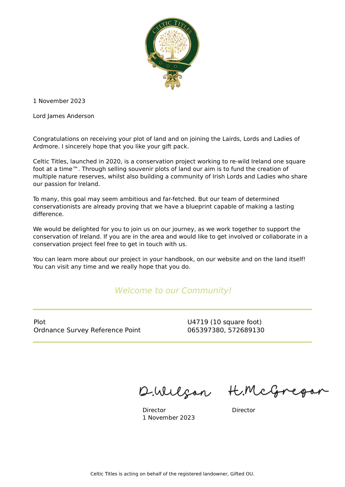 Приобретая лучший подарок - Титул Лорда или Леди Ирландии и 10 квадратных футов земли в Ирландии (Ardmore) Вы получаете: