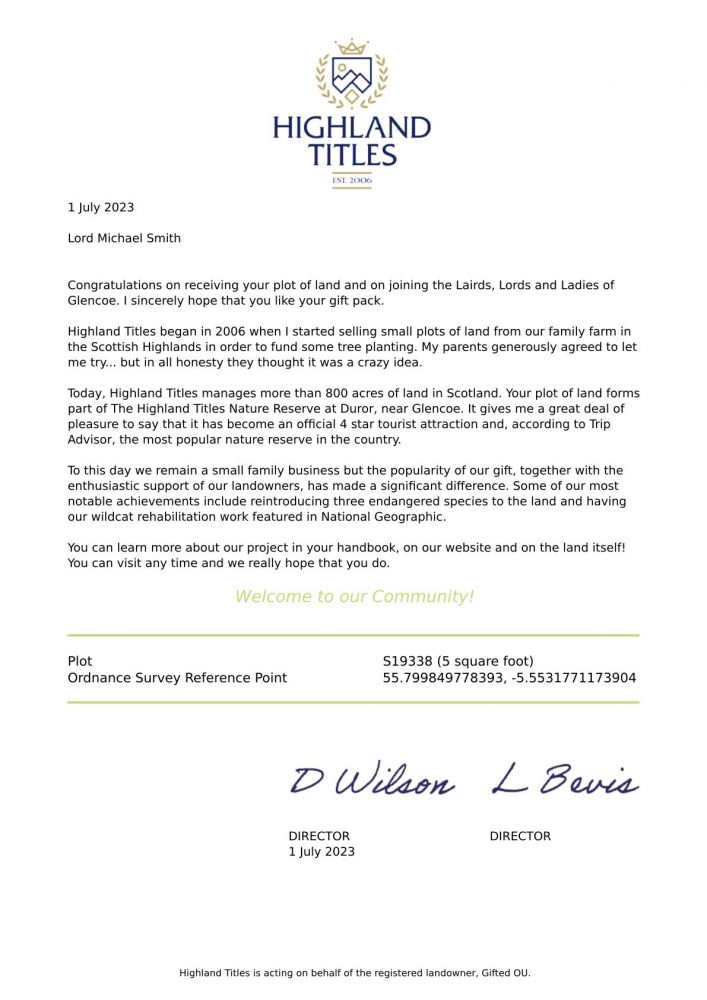 5 квадратных футов земельного надела в Шотландии и Вы официально можете носить титул Лорда или Леди и иметь в личном распоряжении земельный надел на территории Шотландии, который сможете беспрепятственно посещать в любое время. Это будет лучший подарок для любого случая.