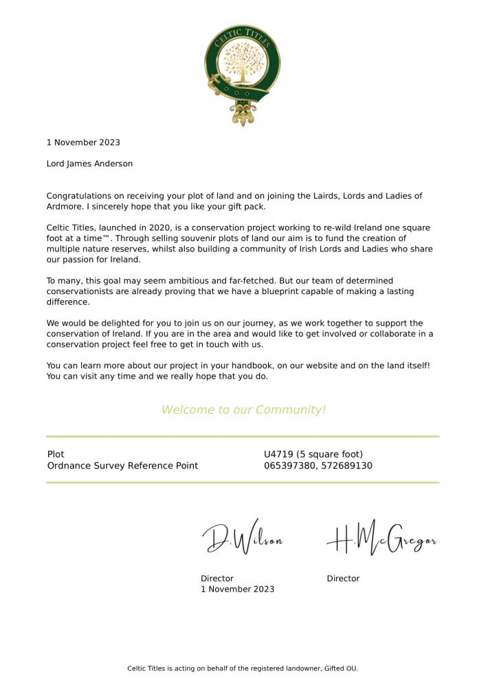 Приобретая этот необычный подарок - Титул Лорда и Леди Ирландии и 5 квадратных футов земли в Ирландии (Ardmore) Вы получаете: