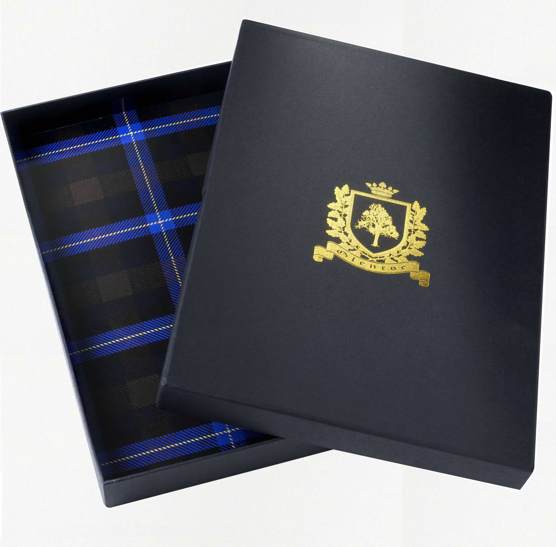 Красивая подарочная упаковка с гравировкой герба Glencoe на крышке и подложкой с рисунком тартана Glencoe.